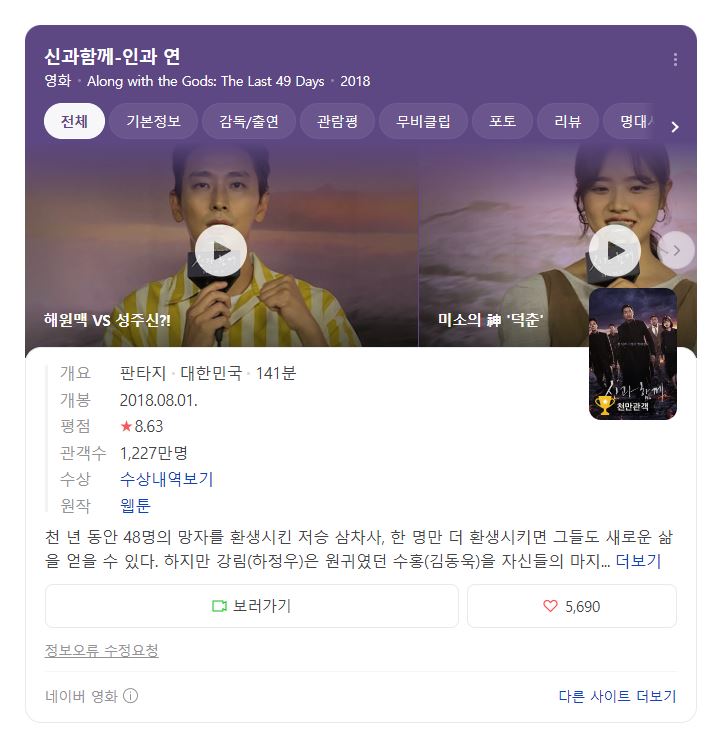 신과함께 인과연은 주호민 작가님의 인기 웹툰을 원작으로 한 영화로 1000만 관객을 돌파한 영화입니다!